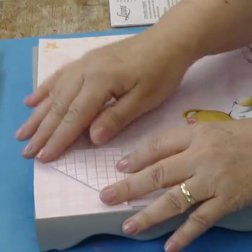 33. Recorte um pedaço de papel para scrapbook no tamanho da parte interna da tampa, cole a découpage adesiva sobre o papel e cole o papel no verso da tampa.