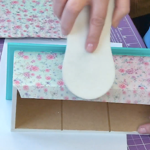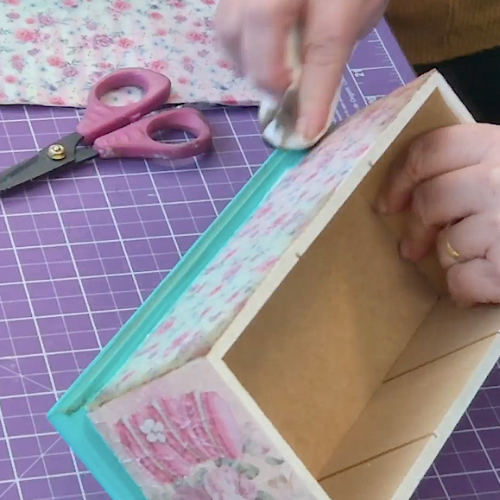 37. Cole o aplique sobre a lateral maior da caixa com découpage.