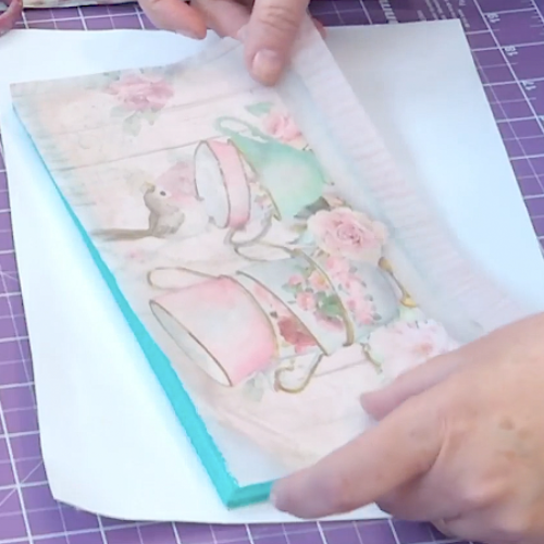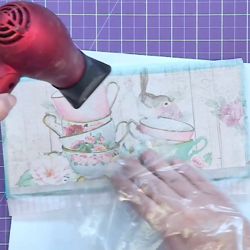 19. Alise bem o papel, reforçando a colagem e retirando as imperfeições, com um pedaço de plástico. Aproxime o secador para retirar possíveis bolhas de ar que se formaram.