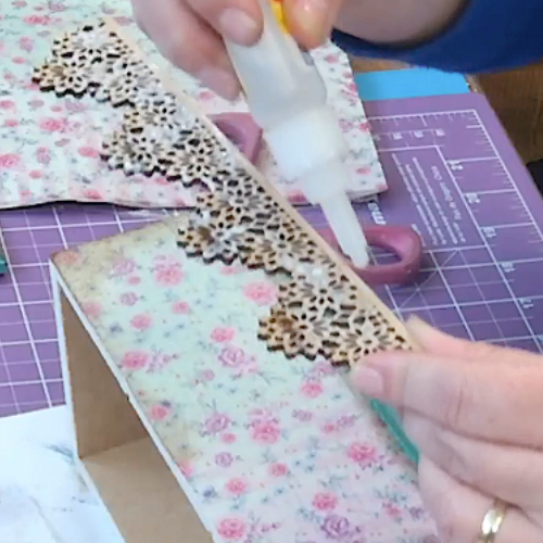38. Repita o processo para colar o aplique menor sobre a lateral menor da caixa.