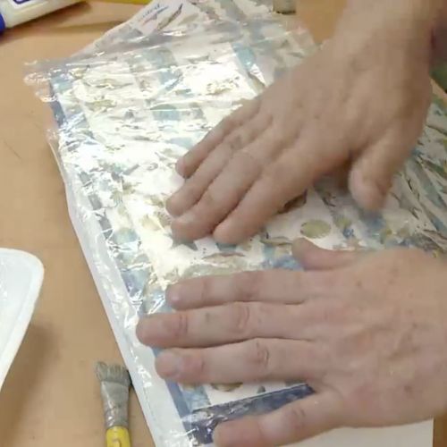 18. Cole o recorte na frente da base da caixa e alise com a espátula, protegendo o recorte com um plástico.
