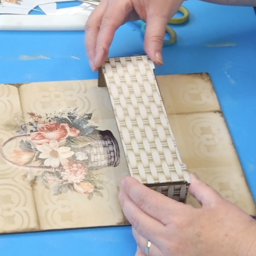 24. Risque o contorno das partes do porta cartas no verso da estampa adesiva com motivo de cestaria.
